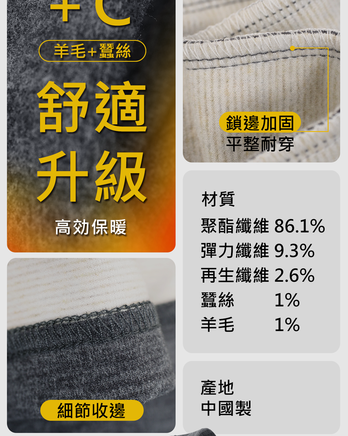 🏅 羊毛+蠶絲混紡:提升保暖與柔軟度,肌膚接觸更舒適。